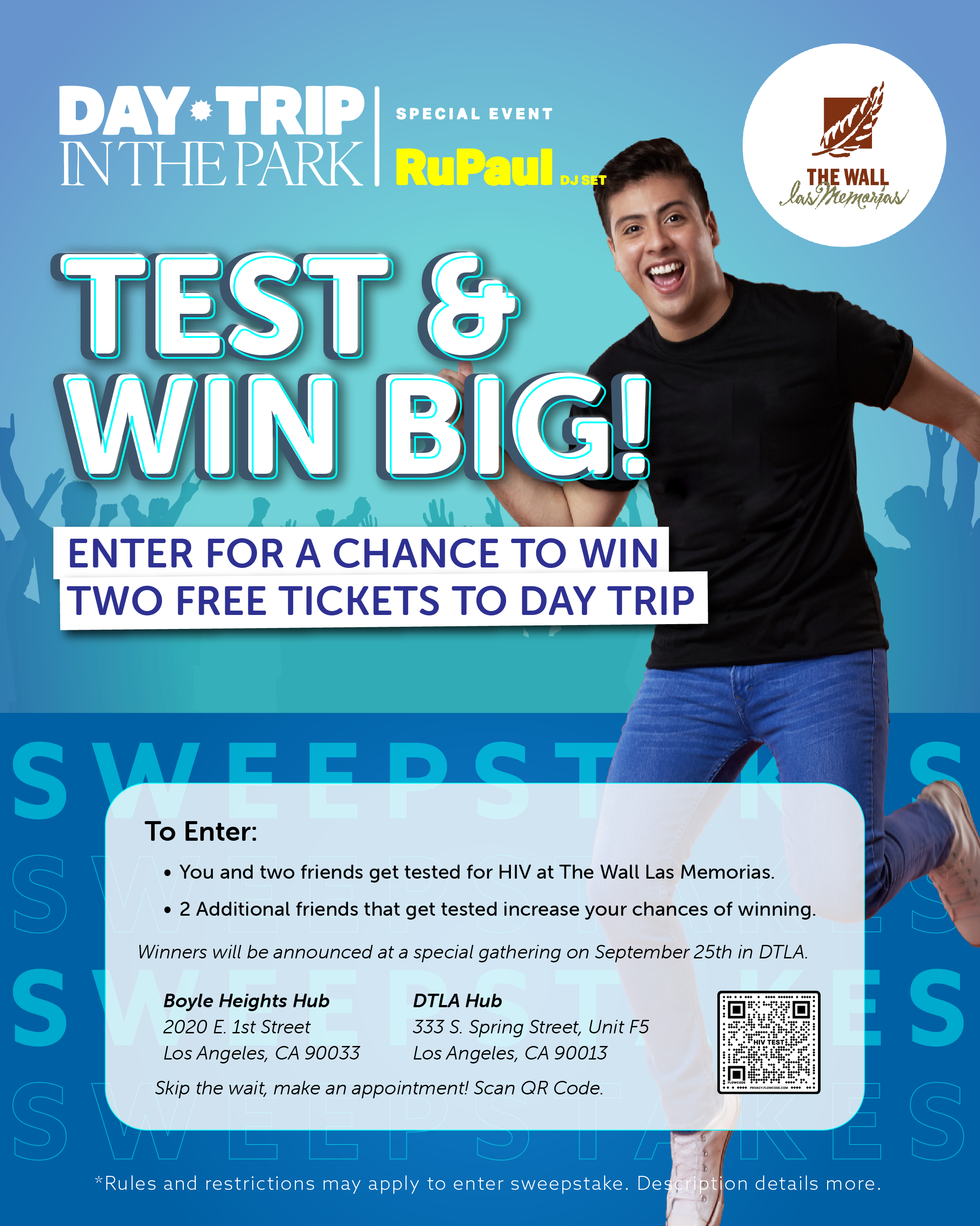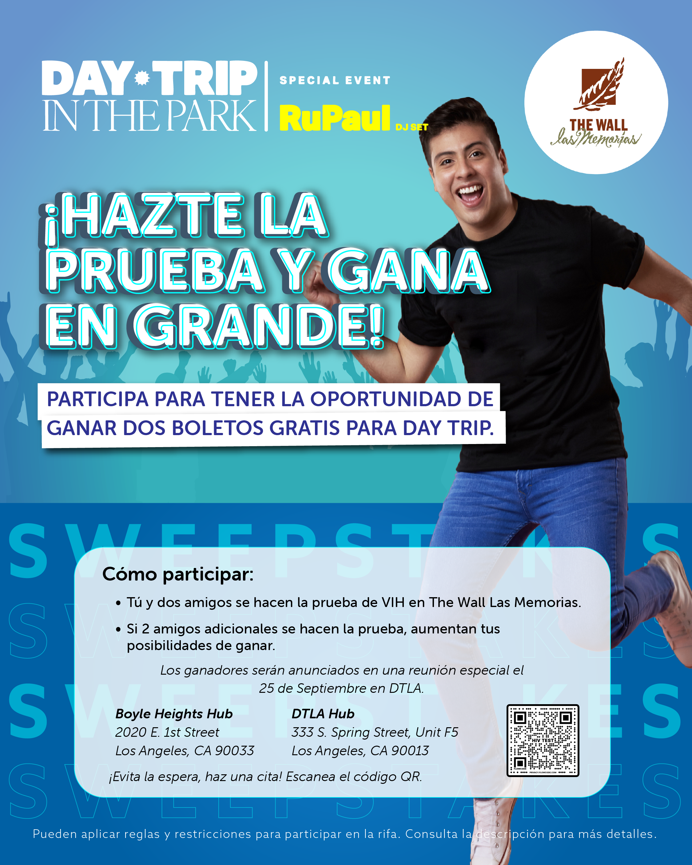 Reglas para Participar: Tú y dos amigos deben hacerse la prueba del VIH en The Wall Las Memorias. Cómo Funciona: ✅ Hazte la prueba del VIH en una de nuestras ubicaciones con dos amigos – ¡automáticamente estarás participando para ganar! ✅ Trae amigos adicionales para hacerse la prueba – ganarás entradas adicionales al sorteo por cada 2 amigos que se hagan la prueba. ✅ ¡Mientras más amigos traigas, mayores serán tus posibilidades de ganar! Elegibilidad